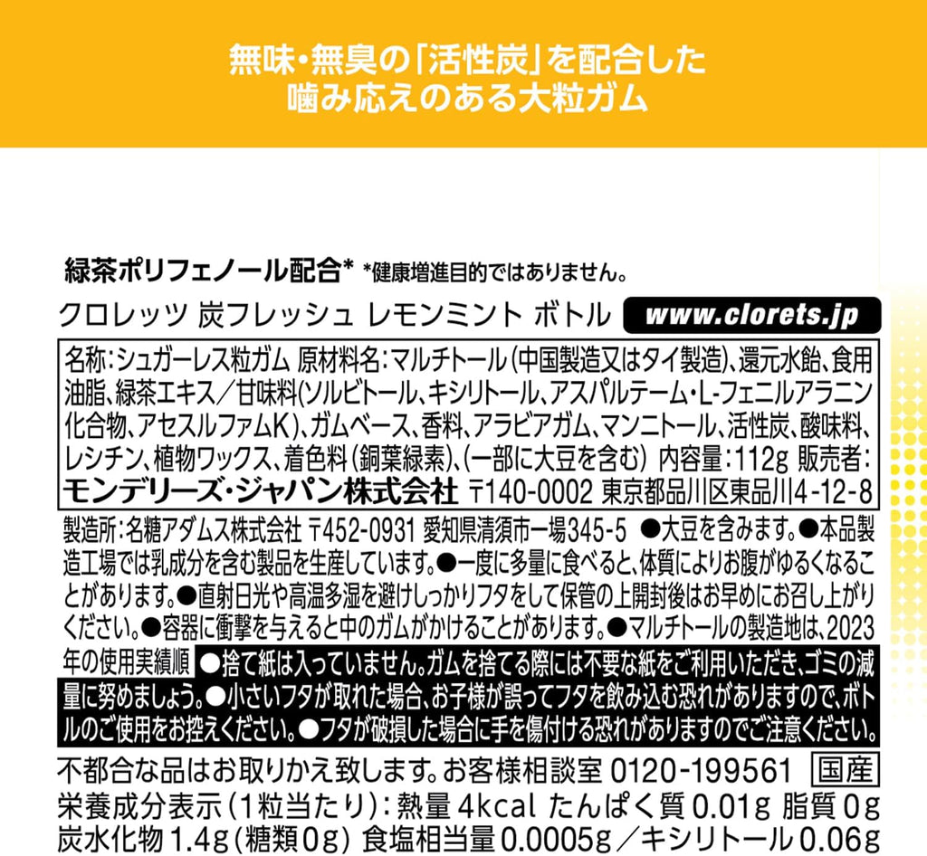 Clorets Gum Charcoal Rasa Lemon Segar Mint Tipe Botol 127g Mondelez Japan