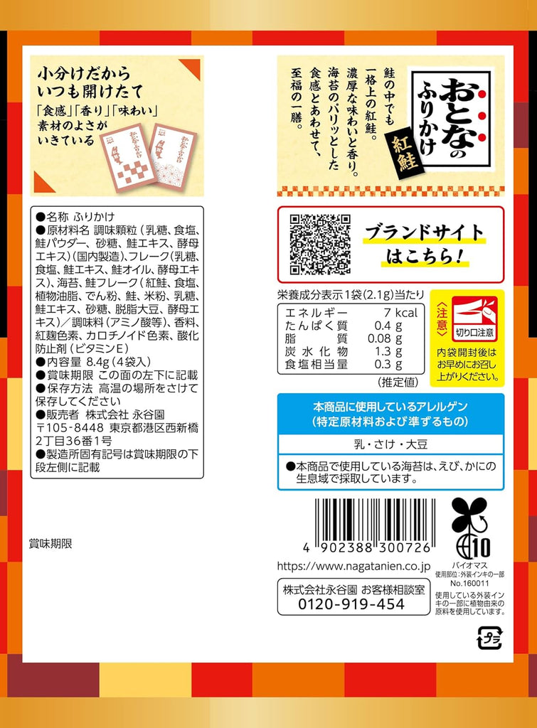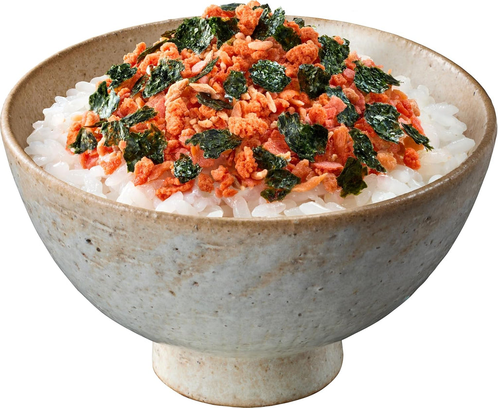 Este furikake é feito com bastante alga deliciosa que selecionamos pessoalmente de áreas produtoras de algas em todo o país, e com certeza irá satisfazer tanto adultos quanto crianças. Ele utiliza flocos de salmão que foram desfiados e temperados. Você pode aproveitar ao máximo a delícia do salmão.